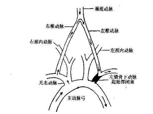 严重的锁骨下动脉狭窄或闭塞,不仅仅出现上肢血压下降,最重要的是导致锁骨下动脉窃血综合征,即指在锁骨下动脉或头臂干的椎动脉起始处的近心段有部分的或完全的闭塞性损害,由于虹吸作用,引起患侧椎动脉中的血流逆行,进入患侧锁骨下动脉的远心端,导致椎-基动脉缺血性发作和患侧上肢缺血性的症候。可以有脑缺血或上肢缺血症状,甚至缺血性脑卒中(示意图如下)。