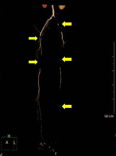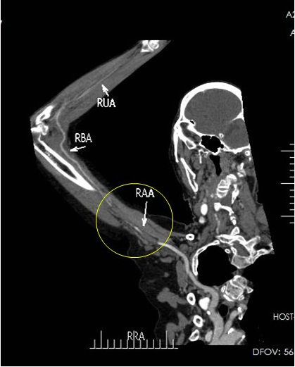 ▲ 图4:CTA提示左侧腋动脉及肱动脉栓塞