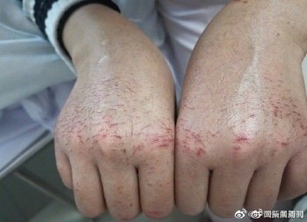 2、皮肤屏障破坏与刺激反应:由于脂溶性消毒剂容易溶解皮肤表面皮脂膜,反复使用这类消毒剂容易导致皮肤屏障功能破坏,出现皮肤皲裂。第一幅图的护士就是因为消毒剂反复使用导致的。处置原则:加强润肤剂使用,其它措施同过敏性接触性皮炎的处理。