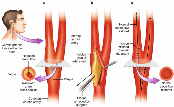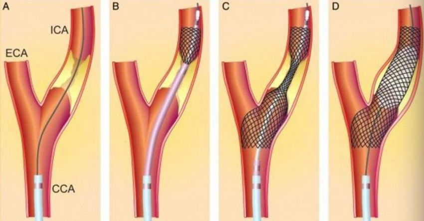 手术治疗主要包括经典的颈动脉内膜剥脱术(CEA)和颈动脉支架置入术(CAS)。CEA是一种开放式手术,在颈部切口后找到颈动脉,将其切开,将斑块及内膜剥除,历史较为悠久,疗效确切,安全性有保证(图5)。CAS则是近20年来出现的微创腔内治疗方式,其原理是通过穿刺肢体动脉,将支架从血管内输送至斑块狭窄处并释放,靠支架的支撑力将斑块向外挤压,从而恢复有效的管腔,具有不切口、不麻醉、恢复快等优点(图6),随着腔内技术的逐渐发展和完善,CAS逐渐走向成熟,其效果能和经典的CEA媲美。