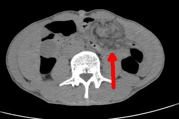 ▲ 术前腹部CT可见小肠“旋涡”征,提示肠扭转