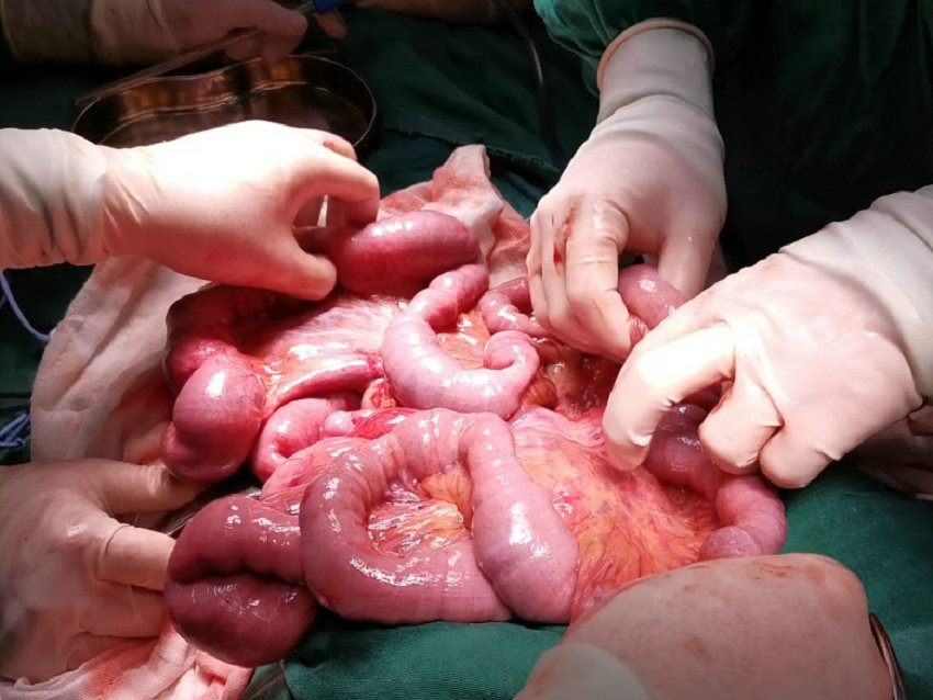 在一系列紧张而又有序的术前准备后,患者顺利进入手术室。手术由傅聿铭主任医师主刀,吴万庆副主任医师担任助手。术中探查发现腹腔大量淡红色渗出,全段小肠广泛淤血水肿青紫,肠系膜扭转成团,小肠扭转超过720°。