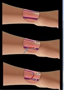 肾衰竭的患者在进行血液透析前,首先要建立一条血管通路,也就是适合透析管路穿刺的血管(图3)。一条稳定可靠的血管通路,是顺利进行血液透析的基本保证。良好的血管通路的基本要求包括:血流量要最够大,能够达到200---300ml/min;维持透析的血管通路可重复使用,适合反复穿刺,能长期维持;尽量不限制患者的日常生活,如一般运动、洗澡等;防止感染;手术方法尽可能简单,成功率高。