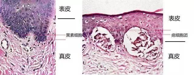 正常情况下,黑色素细胞均匀分布在皮肤中,当数量增多,并呈巢样长在一起时,便形成了黑色素痣。