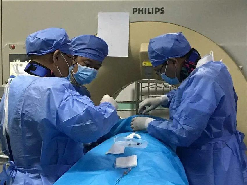 ▲ 郭彦伟主任、王振豫特聘教授和吴峰主治医师进行CT引导下微创示范手术
