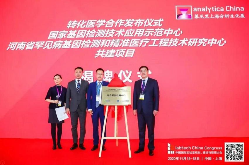 2020年11月17日上午,国家基因检测技术应用示范中心&河南省罕见病基因检测和精准医疗工程技术研究中心联合基因检测中心揭牌仪式在上海新国际博览中心成功举行。慕尼黑展览(上海)有限公司大中华区首席运营官路王斌、伯豪生物营销中心负责人陈小涛总监,郑州大学五附院副院长、河南省罕见病基因检测和精准医疗工程技术研究中心主任汤有才为联合基因检测中心揭牌。揭牌仪式特别邀请了上海生物工程学会转化医学专委会秘书长徐晓晶博士担任主持。