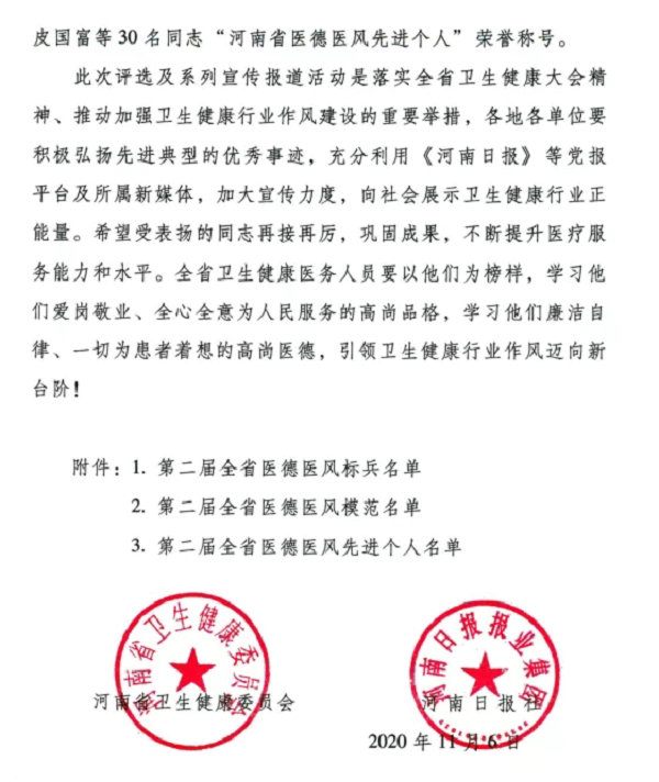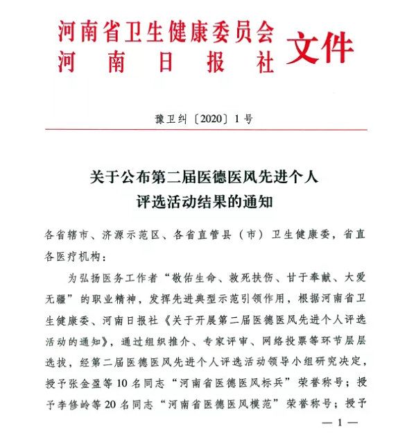为弘扬医务工作者“敬佑生命、救死扶伤、甘于奉献、大爱无疆”的职业精神,发挥先进典型示范引领作用,根据河南省卫生健康委、河南日报社《关于开展第二届医德医风先进个人评选活动的通知》,通过组织推介、专家评审、网络投票等环节层层选拔,经第二届医德医风先进个人评选活动领导小组研究决定,授予10名“医德医风标兵”、20名“医德医风模范”和30名“医德医风先进个人”荣誉称号。郑州大学五附院消化内科三病区、发热门诊主任张淑凤获得“河南省第二届医德医风先进个人”荣誉称号。