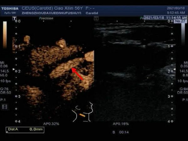 颈动脉斑块超声造影(CEUS)则是通过注射造影剂来显示颈动脉局部有无斑块、斑块大小、位置、回声、斑块内有无新生血管及新生血管含量、分布;颈动脉管腔局部有无狭窄及狭窄程度;颈动脉支架位置、局部有无再狭窄等。